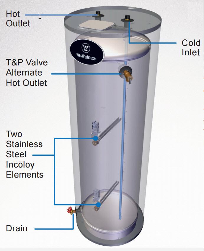 The Westinghouse electric water heater combines high quality stainless steel construction and energy efficient operation providing long draws of hot water without consuming large amounts of energy. A cleverly designed water connection directs cold water to the heating element near the bottom of the tank to minimize the mixing of cold and hot water. ... View Full Source